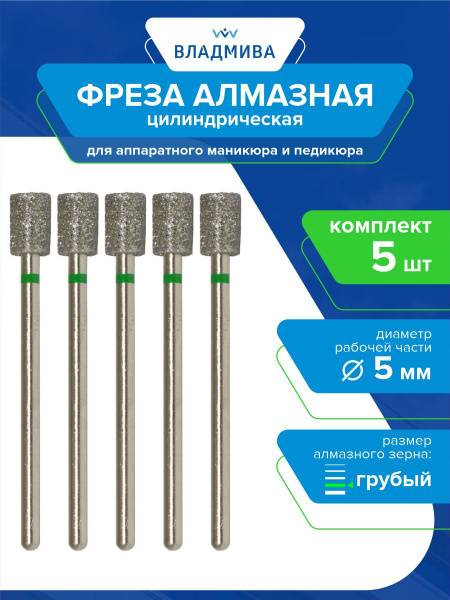 This premium 5-piece set features diamond cylinder nail bits with a coarse grit and a 5.0 mm diameter. Specifically designed for professional aparat manicure and pedicure by TD "VladMiVa," these bits are ideal for nail extensions, design, and correction, as well as for treating calloused skin.