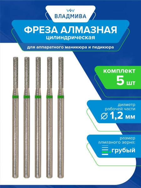 This professional 5-piece set features coarse grit diamond cylinder burs, each with a 1.2mm diameter working end. Designed by TD "VladMiVa," these diamond burs are essential for advanced hardware manicures and pedicures. They are expertly crafted for nail sculpting, intricate design work, and precise correction of the nail plate. Additionally, these versatile burs effectively treat hardened skin.