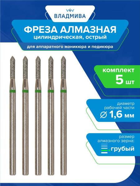 This 5-piece set features sharp, coarse grit diamond carbide burrs with a cylindrical shape. Each burr has a 1.6mm working diameter and an 8mm working length. Ideal for e-file manicures and pedicures, these burrs from TD "VladMiVa" are perfect for nail enhancements, intricate designs, nail corrections, and cuticle refinement. The coarse grit is indicated by a green band. Engineered with a reinforced texture, these burrs boast superior surface strength and hardness, doubling their wear resistance and lifespan. Easily disinfected, this essential burr is a fundamental component of any essential e-file manicure kit.