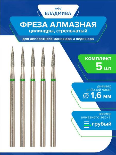 This professional 5-piece set of diamond nail drill bits, part number 876.104.245.100.016, features a cylindrical, ogival shape with a coarse grit for efficient nail and cuticle care. Each bit boasts a 1.6mm working diameter and a 10mm working length, making them ideal for a range of manicure and pedicure applications.