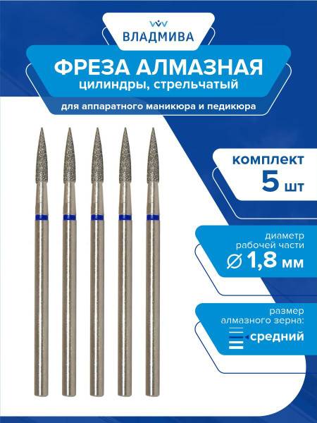 Achieve flawless manicures and pedicures with this 5-piece set of medium-grit diamond nail bits. Expertly crafted in a pointed cylinder shape with a 1.8mm working diameter and 8.0mm working length, these bits are essential for professional nail artists.