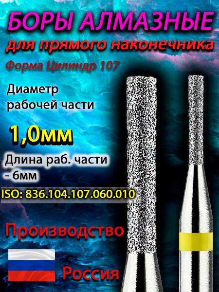 <hr>Боры алмазные цилиндр для прямого наконечника, 1,0мм(010) диаметр рабочей части Длина р.ч. 60мм(5шт) желтые