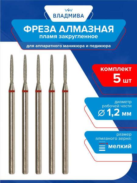 </section> <hr> <section>This 5-piece set includes essential diamond flame bits with a fine 1.2mm grit and rounded tip. Perfect for аппаратный маникюр and pedicure, these bits are your go-to for sculpting, designing, and correcting nails, as well as softening calloused skin. The fine grit (red band) ensures a smooth finish. Benefit from increased durability and a longer service life thanks to the bits' reinforced texture. These easy-to-sanitize bits are a fundamental addition to any nail drill toolkit.