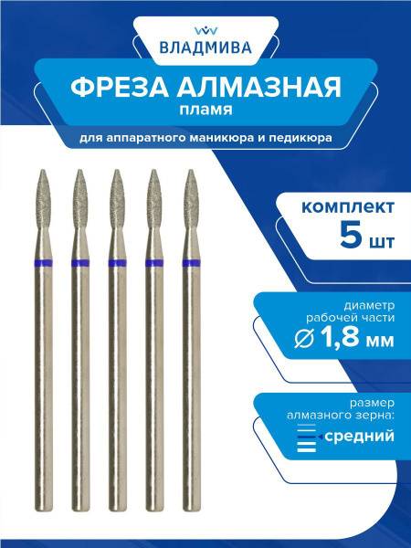 Elevate your nail artistry with this premium 5-piece set of flame-shaped diamond drill bits. Featuring a medium grit, each bit measures 1.8mm in diameter with an 8.0mm working length. Perfect for professional-grade hardware manicures and pedicures, these diamond burs from TD "VladMiVa" are engineered for precision in nail extensions, intricate designs, corrections, and softening calloused skin.