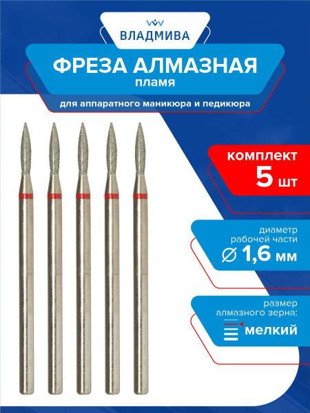 Elevate your nail services with the VladMiVa professional 5-piece diamond flame drill bit set. These fine grit (red marking) bits, with a 1.6mm cutting diameter and 8.0mm working length, are ideal for detailed work including nail extensions, intricate designs, corrections, and treating rough skin during аппаратный маникюр (hardware manicure) and pedicure procedures. The advanced, reinforced surface treatment significantly enhances hardness and durability, leading to a 2x longer service life. Quick to sanitize and a fundamental component for any nail apparatus, this set is a must-have for precision and efficiency. (Part No.: 856.104.243.080.016)