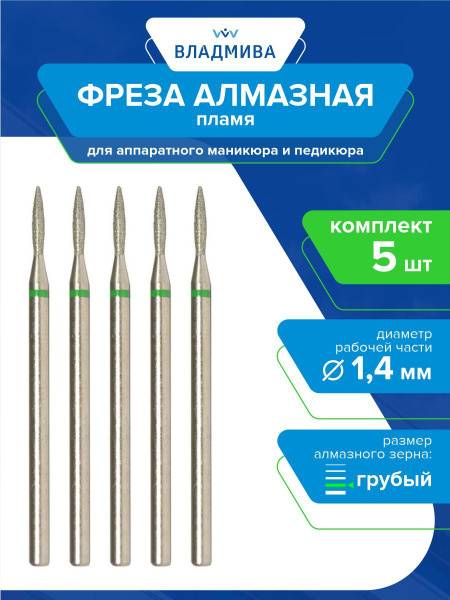 This high-quality 5-piece set features coarse grit flame diamond nail drill bits with a 1.4mm working diameter. Model number 876.104.243.080.014. These diamond burs are expertly crafted by TD "VladMiVa" for professional hardware manicure and pedicure applications.