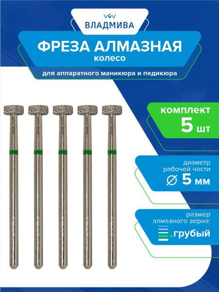 This set includes 5 premium diamond nail file bits shaped like wheels, featuring a coarse grit. Each bit has a working part diameter of 5.0mm and a working part length of 1.8mm. These diamond bits from TD "VladMiVa" are specifically designed for professional e-file manicures and pedicures. They are ideal for nail enhancements, intricate nail art designs, precise nail corrections, and effectively treating rough or callused skin.