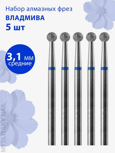 Vladmiva Medium Grit (Blue) Diamond Ball Nail Bit for Manicure, Pedicure & Cuticle Care (5-Piece Pack)