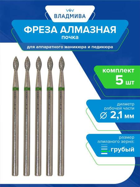This premium 5-piece set features diamond nail burs with a kidney shape and coarse grit, measuring 2.1mm in diameter. The working part has a length of 5mm. Designed for professional e-file manicures and pedicures by TD "VladMiVa," these burs are ideal for nail enhancements, intricate nail designs, and nail plate correction. They are also highly effective for callus and cuticle treatment, addressing hardened skin.