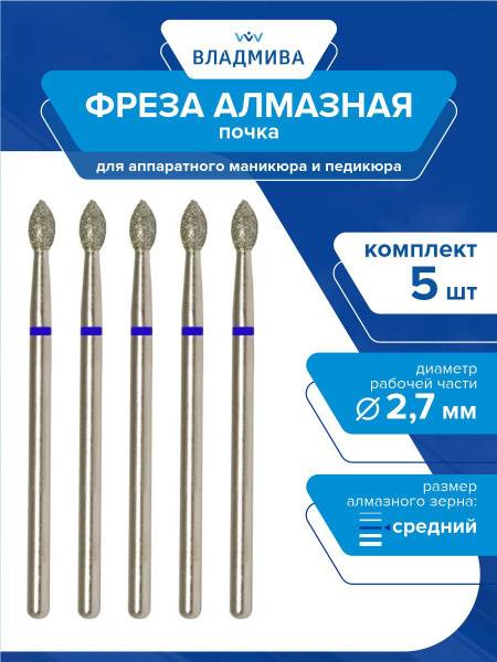 This premium 5-piece set features kidney-shaped diamond nail drill bits with a medium grit, each measuring 2.7mm in diameter. The workpiece of each bit is 5.0mm in length.