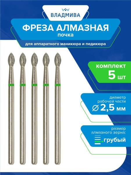</article> <article>This 5-piece set includes professional Diamond Kidney Nail Bits, 2.5mm diameter, with a coarse grit perfect for advanced nail care. From TD "VladiMiVa", these diamond burs are indispensable for nail enhancements, designs, corrections, and tackling callused skin during manicures and pedicures. The kidney shape and coarse abrasion (green marking) provide efficient work. Benefit from an extended lifespan and improved performance due to their reinforced texture, doubling wear resistance. Easily sterilized and a core piece for any nail technician's tool collection. Item code: 876.104.254.050.025.