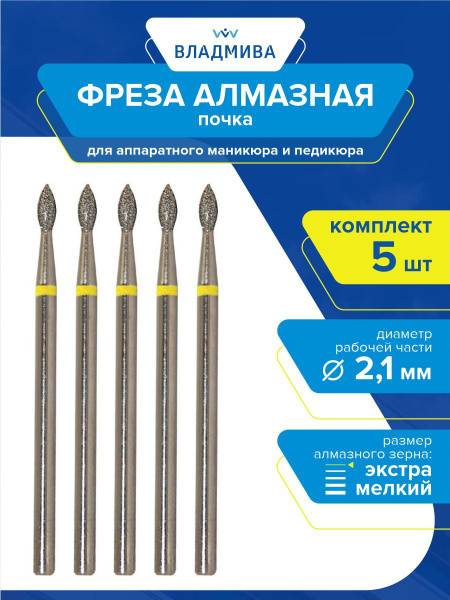 Discover the precision of our Diamond Nail Bur, featuring an extra-fine grit and a 2.1mm diameter. This 5-piece set (836.104.254.050.021) is crafted for professional nail care. The kidney-shaped bur, with its extra-fine abrasive particles, measures 2.1mm in diameter and has a 5mm working length. Ideal for e-file manicures and pedicures, these diamond burs from TD "VladMiVa" excel in nail extensions, design, and correction, as well as for treating callused skin.