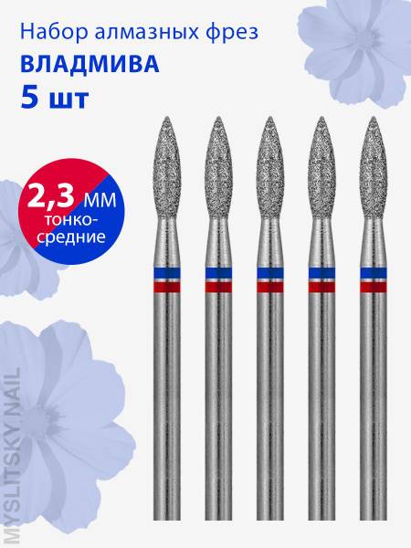 Vladmiva Diamond Nail Drill Bit for Manicure, Pedicure, Cuticle - Flame Shape, Fine-Medium Grit (Red-Blue Stripe), Pack of 5