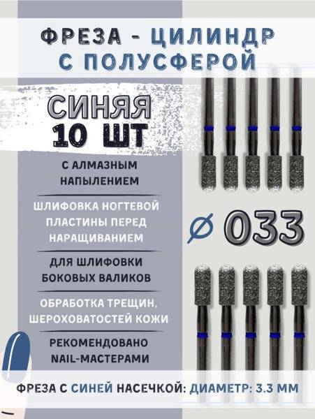 Discover high-quality diamond nail drill bits for manicures and pedicures on Ozon, brought to you by Vladmiva. These professional-grade bits feature a 3.3mm working diameter and 12.0mm length. Their cylindrical semi-sphere shape with a rounded barrel and fine grit make them ideal for expert-level hardware manicures and pedicures.