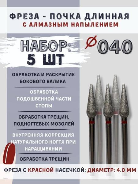 Diamond Nail Drill Bit Set: Kidney Shape, Elongated, 4mm Red Grit for Inner Carving, 5-Piece Professional Manicure & Pedicure Tool