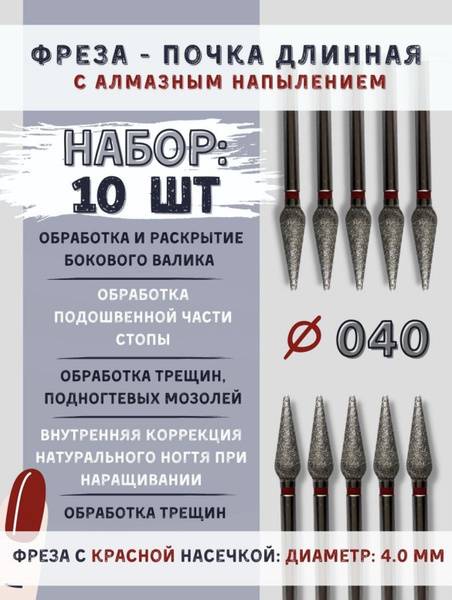 Elevate your manicure and pedicure services with this professional 10-piece set of extended diamond nail drill bits. The "Droplet Kidney" shape, featuring a 4mm diameter and a distinct red grit, is meticulously designed for precise internal nail work and cuticle management. Crafted from premium diamond, these bits guarantee exceptional durability and sustained performance.