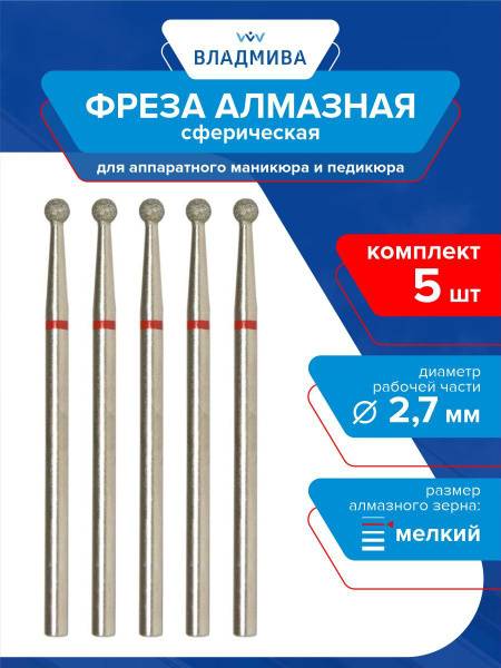 <hr>Elevate your nail artistry with this premium 5-piece set of 2.7mm fine grit spherical diamond burs. Designed for professional e-file manicures and pedicures, these burs are ideal for sculpting, refining, and correcting nail plates, as well as for softening callused skin. The fine grit (red band) is specifically chosen for delicate and precise work. Featuring a reinforced, hardened texture, these diamond burs offer exceptional surface strength and durability, providing up to twice the wear resistance and operational lifespan. They are simple to sanitize and represent a foundational component for any e-file manicure kit. (856.104.001.000.027)