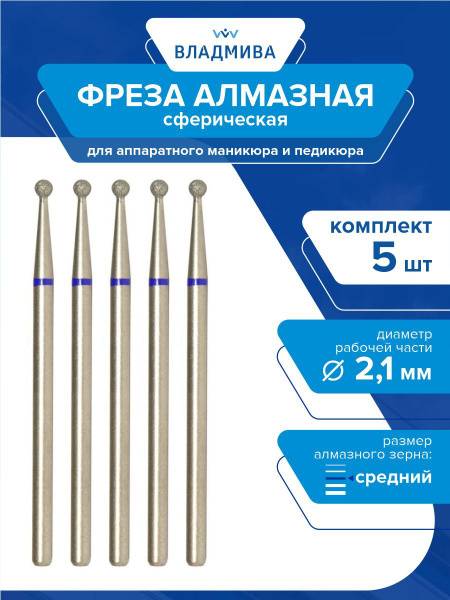 <hr>This set includes 5 high-quality spherical diamond nail drill bits. Each bit features a medium grit, essential for a variety of nail care procedures. The working part of each bit measures 2.1mm in diameter. Manufactured by TD "VladMiVa", these diamond bits are expertly designed for professional e-file manicures and pedicures, ideal for nail enhancements, intricate designs, nail plate correction, and treating calloused skin. The grit level is indicated by a color-coded ring: yellow for extra-fine, red for fine, blue for medium, green for coarse, and black for extra-coarse. These drill bits boast a reinforced texture, providing superior surface strength and hardness for their working parts. This advanced construction doubles their wear resistance and extends their service life significantly. Easily disinfected and sterilized, these bits are a fundamental component of any essential e-file manicure kit.