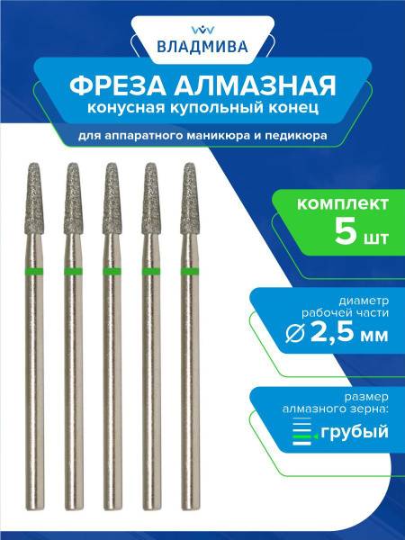 This professional 5-piece set of coarse grit diamond cone burrs features a dome-shaped end and a 2.5mm working diameter. These high-quality diamond burs are expertly crafted for professional hardware manicures and pedicures, ideal for nail extensions, intricate nail art, and precise nail correction. They are also highly effective for smoothing and treating calloused or rough skin.