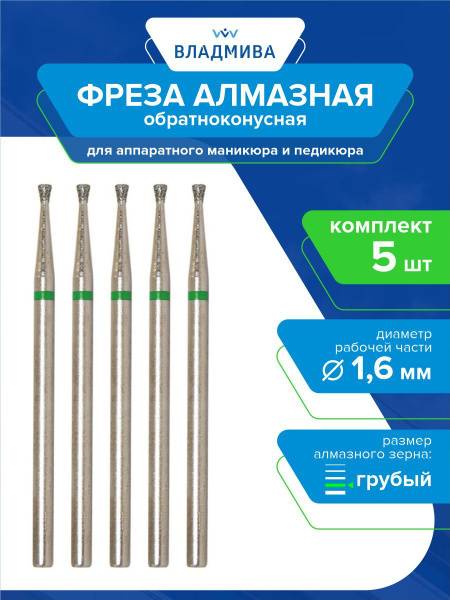 </section> <hr> <section>Upgrade your e-file kit with this 5-piece set of 1.6mm Coarse Grit Diamond Inverted Cone Burs (876.104.010.016.016). These burs are engineered for professional e-file manicures and pedicures, featuring an inverted cone shape and coarse grit perfect for nail building, design, and correction, as well as treating calluses. Grit identification is simplified by color-coded bands: Yellow (Extra Fine), Red (Fine), Blue (Medium), Green (Coarse), Black (Extra Coarse). The advanced, hardened texture provides exceptional surface strength and hardness, resulting in doubled wear resistance and longevity. These diamond burs are easily disinfected, making them a staple for any nail technician.
