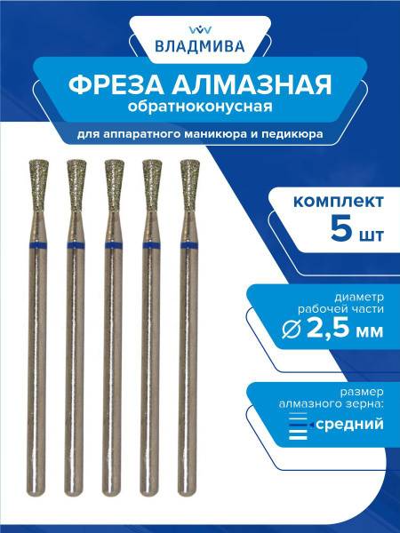 </section> <section>Upgrade your nail toolkit with this 5-piece set of inverted cone diamond burs. Featuring a medium grit and a 2.5mm working diameter, these burs are perfect for all aspects of nail enhancement, from building and design to correction and the treatment of rough skin. The reinforced texture ensures exceptional durability, doubling the bur's lifespan and performance. Color-coded grit indicators (blue for medium) simplify selection. These burs are designed for efficient disinfection and are a vital part of any professional nail art or manicure apparatus.