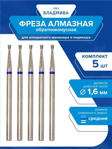 Experience superior performance with this 5-piece set of medium grit taper diamond burs, specifically designed for dental applications. Each bur features a 1.6mm working part diameter and length, ensuring precision for various procedures. Manufactured by TD "VladMiVa," these diamond burs are ideal for nail enhancements, design, correction, and the treatment of rough skin. The blue band indicates medium grit, perfect for controlled abrasion. Enhanced with a reinforced texture, these burs boast exceptional surface strength and hardness, doubling their wear resistance and lifespan. Easily disinfected and a fundamental component of any essential dental handpiece kit (866.104.010.016.016).