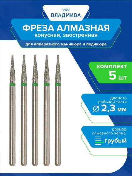 Enhance your nail artistry with this premium set of five coarse grit, tapered diamond nail drill bits. Each bit features a precision-engineered conical, pointed shape with a 2.3mm working diameter and a 10mm working length. Perfect for professional hardware manicures and pedicures, these durable diamond bits from TD "VladMiVa" are ideal for nail enhancements, intricate designs, corrections, and safely treating callused skin.