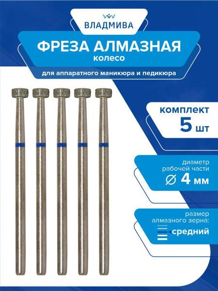 Diamond nail drill bit, medium grit, 4.0 mm. Set of 5 pcs. (866.104.040.008.040). A set of five diamond nail drill bits. Form - wheel, medium grit. Working part diameter - 4.0 mm. Working part length - 0.8 mm. Diamond nail drill bits for electric manicure and pedicure from TD "VladMiVa" are designed for working with nail enhancements, designs, and corrections, as well as for treating rough skin. The primary working characteristic of a drill bit is its grit, determined by the colored ring: a yellow ring indicates very fine grit, red indicates fine grit, blue indicates medium grit, green indicates coarse grit, and black indicates very coarse grit. The reinforced texture of the drill bit provides a high surface strength and hardness of the working part, which in turn doubles its wear resistance and service life. The drill bit is quickly and easily disinfected and is one of the essential minimal set of bits for a nail drill machine (866.104.040.008.040).