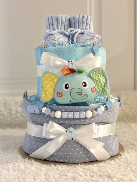 Adorable Elephant-themed diaper cake, a perfect newborn baby gift for boys. This thoughtfully curated gift set includes premium Japanese Momi diapers (sizes M & S), a soft Crockid bodysuit, knitted booties, a soother holder, a rattle, a greeting card, and beautiful decorative elements. A truly special and practical present for new parents.