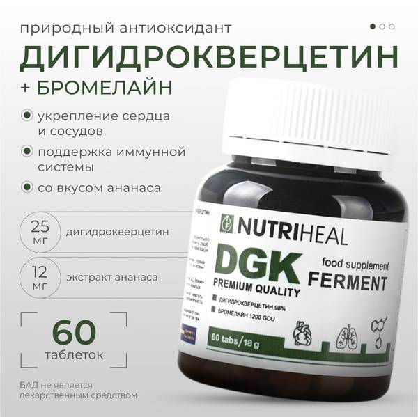 Keywords: Dihydroquercetin, DHQ, Taxifolin, Bromelain, Antioxidant, Supplement, Heart Health, Cardiovascular Health, Lung Health, Respiratory Support, Immune Support, Siberian Larch, Pineapple Extract, Blood Pressure, Cholesterol, Varicose Veins, Atherosclerosis, Cognitive Function, Memory, Concentration, Anti-inflammatory, Sublingual Tablets, Nutriheal, GMO-Free, Natural Supplement, 60 Tablets.