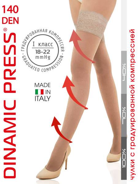 Discover premium quality Dinamic Press 1st class compression stockings (18-22 mmHg) in a natural beige hue. Designed for women, these Italian-made compression stockings are an effective solution for preventing and treating venous leg diseases. Manufactured with precision using Swiss equipment for precise compression, our stockings are not just a stylish and functional accessory but a true boon for your leg health.