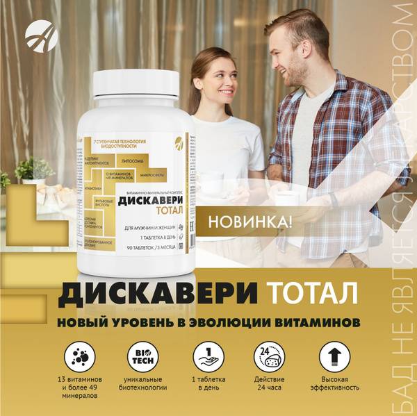 Discovery TOTAL is a comprehensive multivitamin and mineral complex for men and women, providing 24-hour support for optimal health. This advanced formula utilizes cutting-edge technology and considers the biochemical interactions and transformations of vitamins within the body. Discovery TOTAL contains a full spectrum of nutrients to effectively address deficiencies, ensuring targeted delivery and maximum bioavailability. Its slow-release technology maintains consistent nutrient levels in the bloodstream, avoiding fluctuations. Physiologically balanced dosages make it suitable for both men and women. This vegetarian formula is lactose-free, dairy-free, and titanium dioxide-free. One bottle provides a 3-month supply (90 tablets). A single daily tablet delivers 24-hour multifactorial support, thanks to a 7-step targeted delivery system: