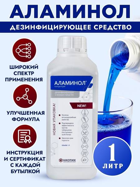 Alaminol disinfectant and cleaning concentrate (1 liter) from FGUP GNTS "NIOPIK," a leading Russian manufacturer. As official NIOPIK representatives, we offer genuine product at competitive prices. (Note: The cup shown in the image is for illustrative purposes only; it's not included.) A complete kit with a 250ml cup and gloves is available (item # 219133448). Each bottle includes a certificate and instructions.
