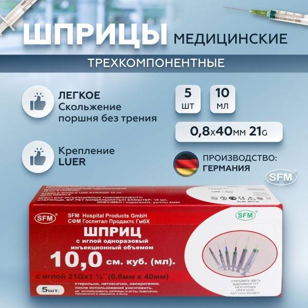 SFM Hospital Products GmbH offers high-quality, sterile, disposable three-part syringes for subcutaneous and intramuscular injections, and other medical procedures. These 10ml syringes feature a smooth-gliding piston for comfortable injection, an integrated needle (21G, 0.8 x 40mm), precise graduations for accurate measurement, and a double stop ring to prevent accidental plunger withdrawal. Made from medical-grade polypropylene, these syringes are individually packaged for sterility and are designed for ease of use and safe handling. Manufactured in Germany, ensuring the highest standards of quality and reliability. Available in various sizes (2ml - 100ml).