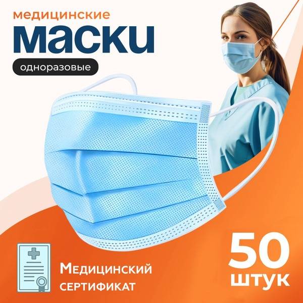 These disposable 3-ply medical face masks are crafted from high-quality, non-woven material consisting of three layers: spunbond – meltblown – spunbond. The inner spunbond layer rapidly absorbs and wicks away moisture (exhaled breath and perspiration). The middle meltblown layer, with its microporous structure, creates a fine mesh of interwoven polypropylene fibers. This effectively traps even the smallest bacteria, preventing their spread, and absorbs and distributes exhaled moisture across the mask's surface. The outer spunbond layer (hydrophobic) prevents liquid from penetrating outwards. A flexible nose piece is incorporated at the top for a secure, customized fit to individual nose shapes. The masks feature comfortable, round ear loops for secure and comfortable wear. Each pack contains 50 masks.