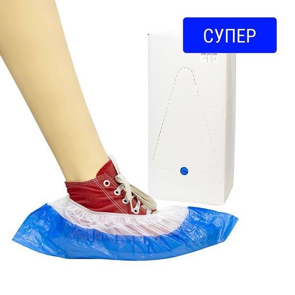 Heavy-duty, disposable medical shoe covers featuring a double elastic band and double sole for superior strength and comfort. Made from high and low-density polyethylene (HDPE/LDPE) for reliable protection. These white and blue shoe covers comfortably fit shoes up to size 48 (14x40 cm). Convenient euroblock packaging (500 pairs) with a built-in dispenser for easy access. Made in Russia from high-quality, primary polyethylene.