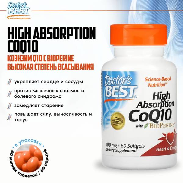 Doctor's Best High Absorption CoQ10 (Ubiquinone) with BioPerine offers superior absorption for enhanced heart health and energy production. CoQ10 is crucial for ATP production, especially in the heart, but levels can decline with age, stress, statin use, and free radical damage. BioPerine® significantly improves CoQ10 absorption. This naturally fermented, high-potency formula supports cardiovascular health, energy levels, and helps replenish CoQ10 levels naturally depleted by age or medication. Each 600mg capsule (±5%) provides optimal support. Take one daily with food, or as directed by your healthcare professional. These statements have not been evaluated by the Food and Drug Administration. This product is not intended to diagnose, treat, cure, or prevent any disease.