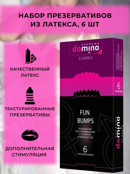 Description: Experience classic intimacy redefined. Domino Classic Fun Bumps condoms feature a "Nice Contour" textured surface with raised bumps for enhanced stimulation and intense pleasure. The unique dotted and bubbled texture delivers heightened sensation while providing reliable protection. Indulge in ecstasy with Domino Classic Fun Bumps – your gateway to unforgettable moments. Each pack contains 6 condoms. Thickness: 0.06mm. Length: 180mm.