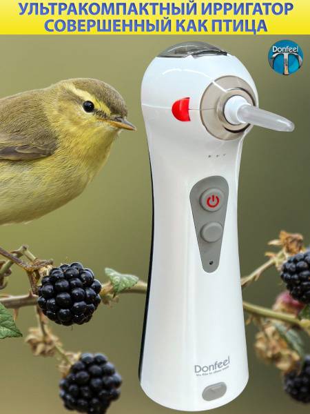 Keywords: Portable oral irrigator, water flosser, Donfeel OR-350 Gen2, oral hygiene, gum health, periodontal disease, gingivitis, plaque removal, interdental cleaning, travel irrigator, compact water flosser, dental implants, braces, crowns, 3 pressure settings, Donfeel, Russia.