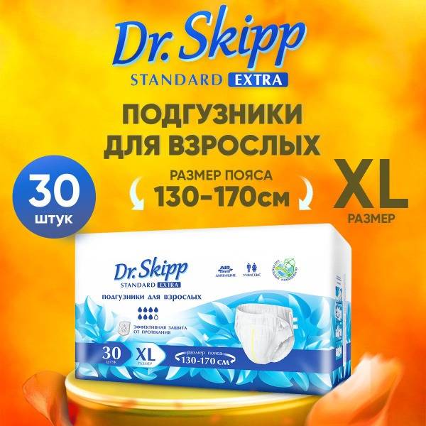 Each pack contains 30 individually wrapped Dr.Skipp Standard Extra XL adult diapers, providing you with convenient and reliable protection. Choose Dr.Skipp for dependable incontinence care and regain your confidence and freedom.