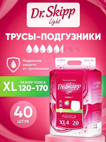 Experience ultimate comfort and discretion with Dr. Skipp Light adult diaper underwear. Designed for individuals with light to moderate incontinence, these breathable, disposable pull-ups offer a lightweight and thin design, making them virtually invisible under clothing. Unlike heavier options, Dr. Skipp Light prioritizes comfort without compromising absorbency. Featuring a soft, elastic waistband, breathable outer layer, 3D leak guards, and flexible leg cuffs, these adult diapers provide superior leak protection and a secure fit. An integrated wetness indicator adds convenience. Hypoallergenic materials ensure gentle care for sensitive skin. Ideal for an active lifestyle, Dr. Skipp Light allows you to maintain your independence and confidence. (Size XL, 120-170cm waist, 40 count pack).
