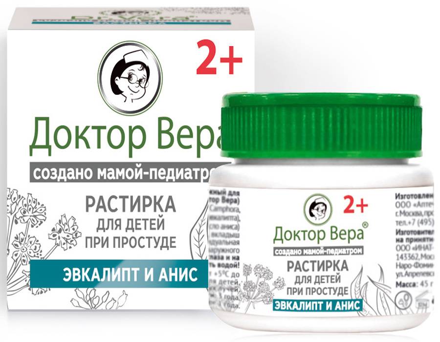 Keywords: Dr. Vera, children's rub, cold rub, flu rub, natural remedy, children's cold medicine, cough relief, congestion relief, muscle pain relief, anise oil, camphor, turpentine, eucalyptus oil, immune support, natural cold remedy, kids cold medicine, 2 year olds, pediatric cold relief, 45g, children's health, winter health, preventative cold care.