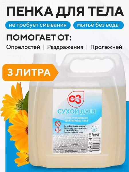 Description: This no-rinse cleansing foam provides daily hygiene for adults with limited mobility, the elderly, bedridden patients, people with disabilities, and those with incontinence. Formulated without water or soap, this hygienic foam offers a complete cleansing and protective solution thanks to its natural active ingredients. Suitable for all skin types, it soothes irritated skin, reducing redness, inflammation, diaper rash, and pressure sores. It promotes healing, restores skin elasticity, and effectively cleanses dirt and impurities, acting as a cosmetic treatment. Containing hydrolyzed calendula and chamomile extracts, it accelerates skin regeneration and prevents further irritation. Ideal for hands, feet, and face, it helps eliminate dry, flaky skin year-round. For external use only. This gentle foam is safe for intimate hygiene in children and adults, including those with incontinence and the elderly. Perfect for treating diaper rash, cleansing intimate areas, and bathing patients. This moisturizing and nourishing no-rinse foam is suitable for the whole family – children, women, and men – effectively combating redness and irritated skin, protecting sensitive baby skin from diaper rash and dryness. It's a convenient soap alternative, ideal for travel, children, water outages, and even as a field-expedient shower solution. This cleansing foam provides comprehensive care and protection for skin exposed to irritating factors. It contains panthenol, a powerful moisturizing and protective ingredient that deeply hydrates, restores elasticity, stimulates skin renewal, and reduces inflammation and irritation. Natural extracts gently cleanse while providing anti-inflammatory and antiseptic action to alleviate irritation, redness, and diaper rash, accelerating skin regeneration. Easy to use without water or soap, this daily care solution, along with wet wipes, offers improved comfort and well-being for bedridden patients experiencing prolonged immobility.