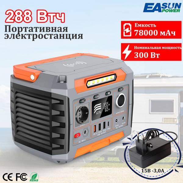 Description: The EASUNPOWER 300W/288Wh portable solar generator is your reliable off-grid power solution. This powerful 78000mAh power bank provides ample capacity to charge multiple devices simultaneously, including phones, laptops, car refrigerators, and drones. Recharge conveniently via car port (7-8 hours), solar panel (8 hours), or AC power (5 hours). Powered by a stable 3.7V 18650 Li-ion battery, it features multiple ports including USB and Type-C for versatile charging options. Enjoy dependable power wherever you go.