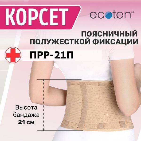 lumbar support corset, back brace, lower back pain relief, back support belt, posture corrector, spinal support, Ecoten, PPR-21P, lumbar pain, osteochondrosis, osteoarthritis, lumbago, myositis, spinal injury recovery, post-surgery recovery, medium support, 21cm height, 6 support stays, breathable, moisture-wicking, beige, size L, sizing guide, contraindications, care instructions.
