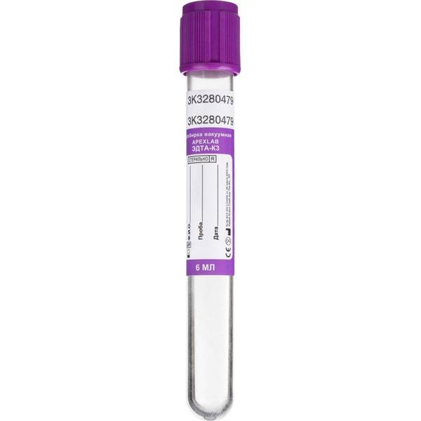 "description": "High-quality 6ml K3 EDTA vacuum blood collection tubes from Apexlab, ideal for hematology. These plastic tubes feature a two-component cap and a violet color code for easy identification. 100 tubes per pack.",