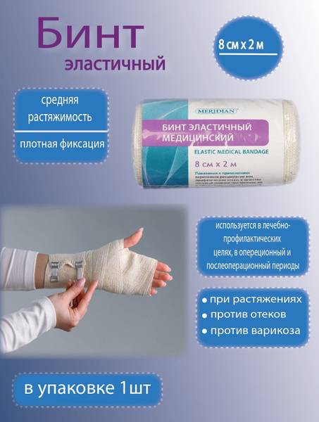 This high-quality 8cm x 2m elastic medical compression bandage from Meridian is ideal for preventing and treating varicose veins, chronic thrombophlebitis, and supporting joints and soft tissues after injuries or surgeries. Its moderate stretch provides secure fixation for various applications, including leg, knee, and ankle support for varicose veins, lymphedema, dislocations, and sprains. Provides relief from overuse and fatigue during physical activity, and helps prevent sprains, injuries, and fractures during sports. Versatile use includes arm, leg, knee, wrist, and ankle support. Perfect for hiking, fishing, and hunting. Individually packaged. Made with certified materials.
