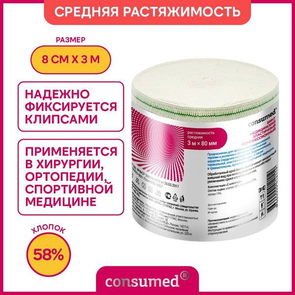 The Consumed medical elastic bandage offers medium stretchability and includes clips for secure fastening, making it ideal for the prevention and treatment of various conditions and injuries. Its finished edge ensures a neat appearance and extends the bandage's lifespan. Crafted from a high-quality blend of cotton, polyester, and latex, it provides reliable support and comfort. The cotton content ensures comfortable wear and excellent breathability.