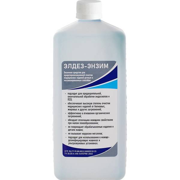 Keywords: Eldez-Enzym, disinfectant, enzymatic cleaner, medical device cleaning, pre-sterilization, endoscopes, high-level disinfection (HLD), ultrasonic cleaning, washer-disinfector, surgical instruments, dental instruments, protease, lipase, amylase, surfactants, 1L, Elmasonic, УЗВ-10/150-ТН-'РЭЛТЕК', УЗО5-01-'МЕДЭЛ', УДЭ-1-'КРОНТ', medical cleaning solution, sterilization, infection control.