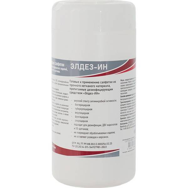 Eldez-IN sporicidal wipes, made of white non-woven material, are uniformly impregnated with the Eldez-IN disinfectant solution. These wipes exhibit high antimicrobial activity against Gram-negative and Gram-positive microorganisms, including Mycobacterium terrae (tuberculosis bacteria), E. coli group bacteria, staphylococci, streptococci, and other nosocomial infection agents. They are also effective against tuberculosis pathogens, viruses (including adenoviruses, influenza viruses, parainfluenza viruses, and other acute respiratory infection agents; enteroviruses; rotaviruses; poliovirus; enteral, parenteral hepatitis viruses; herpes viruses; atypical pneumonia viruses; avian influenza viruses; swine influenza viruses; HIV, and others), Candida and Trichophyton fungi (dermatophytes), mold fungi (tested on Aspergillus brasiliensis and Mucor spp.), anaerobic infection agents, Legionella, and highly dangerous infection agents (plague, cholera, tularemia), including anthrax spores.